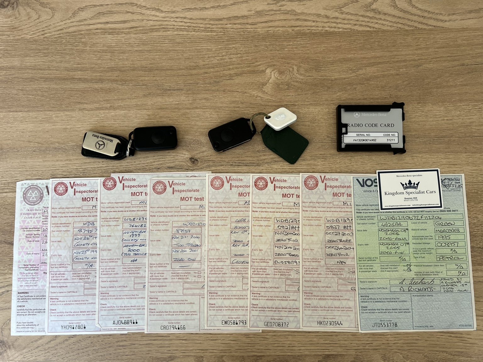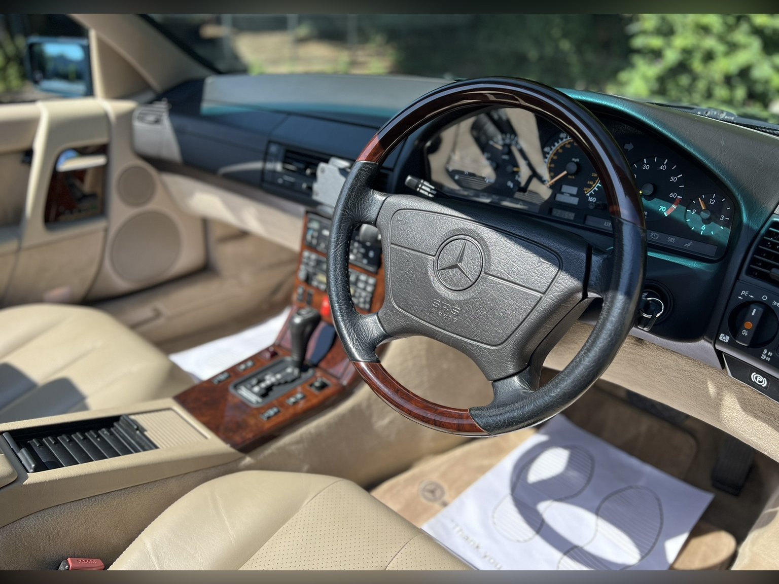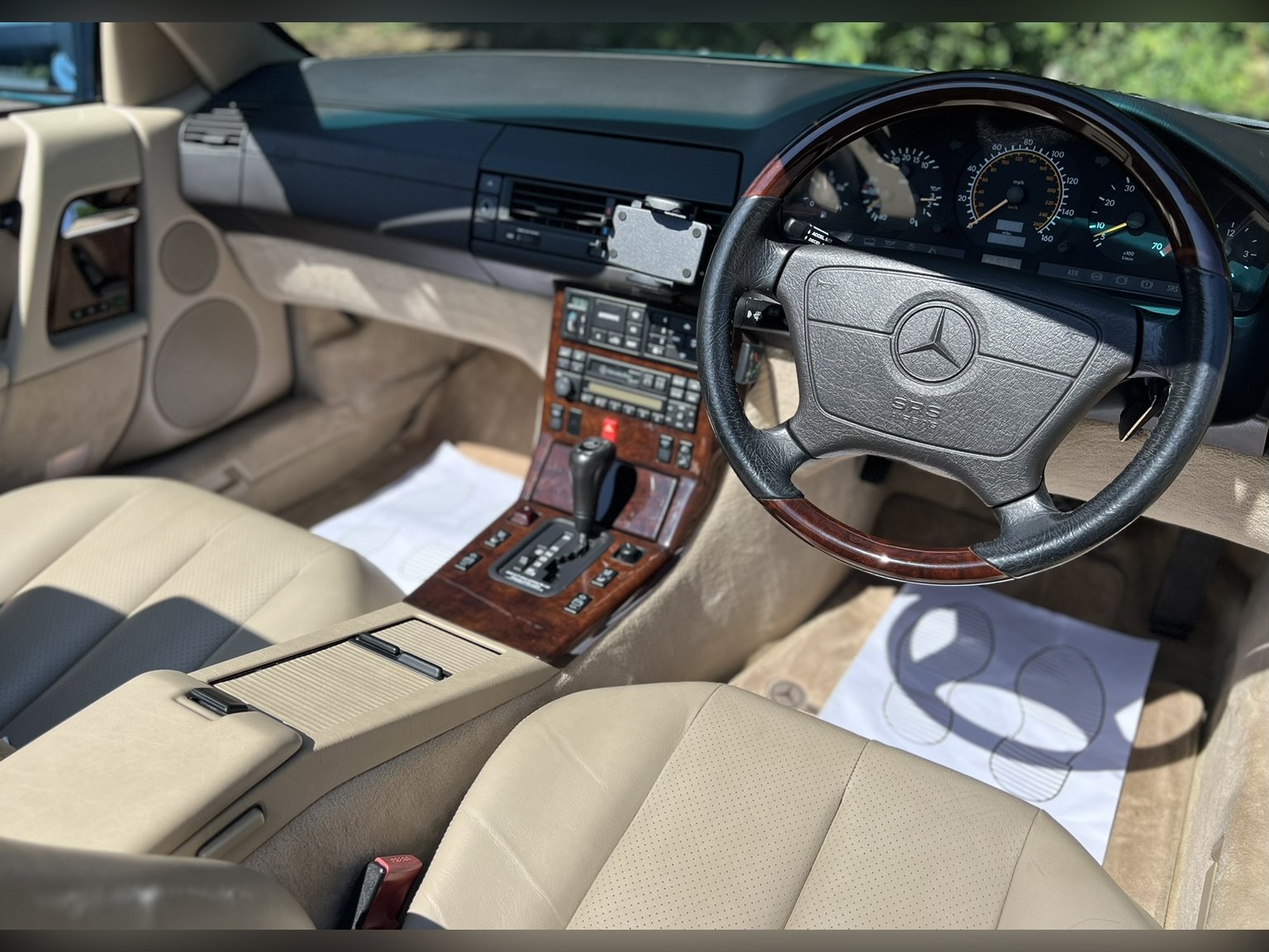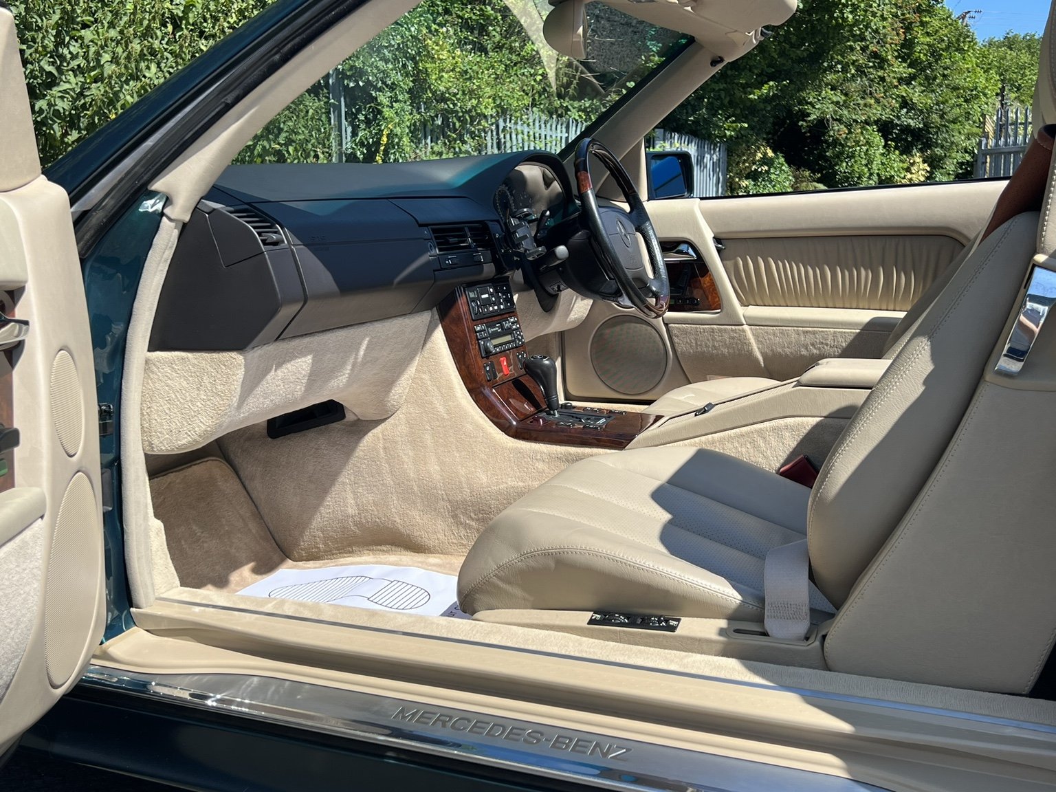 *SOLD - Similar Cars Desired*. Registered in November 1994 (1995 MY) this Mercedes-Benz SL500 R129 series has the incredibly low mileage of just 20,200 miles. Supplied from its most recent owner of seven years, this SL500 has a high factory specification that includes automatic climate control (581), electric memory position seats (241,242), heated seats (873), multi contour seats (404,405) & the rarely optioned orthopaedic seat backrest L&R (406), a wood/leather steering wheel, cruise control and rear seats (565). Finished in Tourmaline Green (269) with contrasting Beige Leather (275A) interior & black mohair soft top. The factory original MB Exquisite (Panasonic) radio/cassette unit (511) is fitted & is paired with the original Alpine CD multi changer (819) located in the boot. The full tool kit, first aid kit and mesh draft breaker & holder are also present. As you’d expect of an SL R129 with 20k miles, the interior is unmarked and presents accordingly with lustrous walnut wood veneer and supple leather seating & door cards. The headlining & trim of both hard & soft tops are unmarked. The interior is just a wonderful place to be in this car & nostalgically takes one back to that day in November 1994 when the car was collected by its first owner. Supplied with its full book pack in which a fully stamped service booklet is accompanied by an additional service booklet. Having been owned by collectors prior, as you’d expect a large history file is also present containing receipts from works carried out during its lifetime. If that’s not enough you will be satisfied to know that each MoT certificate is also present from 1997 & all of this detailed history is presented in a series of three very well organised folders. One for the fastidious collector this SL500 R129 with just 20k miles will be the key addition to any top level collection of Mercedes-Benz. Do enquire for further details or to arrange a viewing.